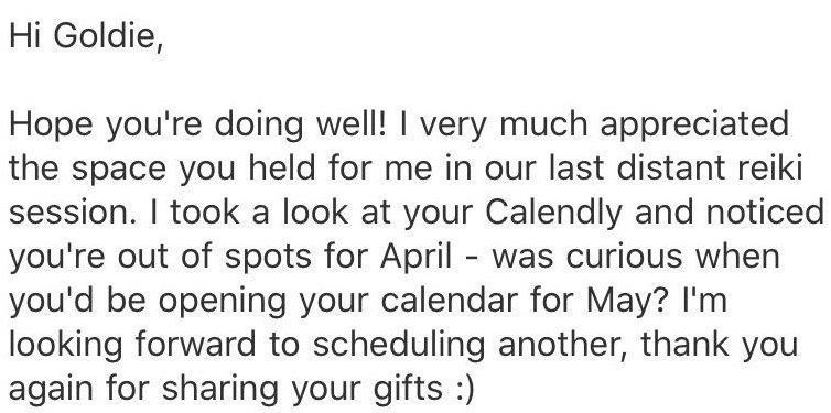 Goldie received her Usui Reiki Level I and II Certification at Minka Studio in Brooklyn, NY. She has held 100+ sessions for 100+ clients globally. She offered free sessions from February 2020 to June 2020 to hold space for those seeking healing at the beginning of the pandemic. Because she believes that everyone can truly benefit from energy healing, she is diligently brainstorming ways to make her services affordable and accessible while maintaining a sustainable long-term operation to hold this space for others. She has dealt with burn out and compassion fatigue through nursing which ultimately led her to reiki so sustainability in wellness for her clients as well as for Your Healing Ventures is a priority.